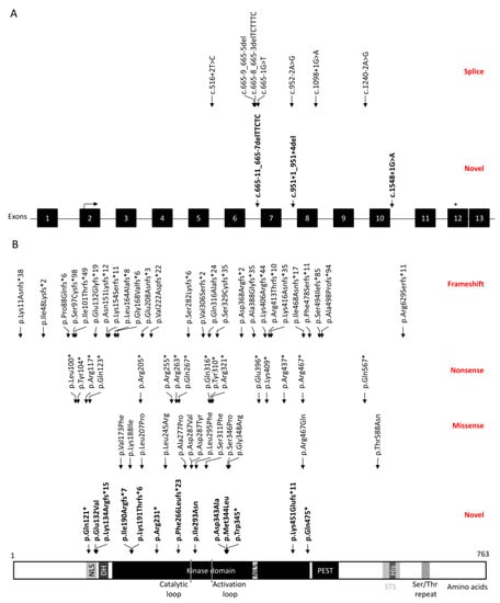 Mutational spectrum of DYRK1A-related intellectual disability syndrome. (A) Splice site variants are depicted across the 13 exons of DYRK1A (NM_001396.5). Novel splice site variants are in bold. (B) Amino acid change of frameshift, nonsense, missense and novel variants are mapped across the DYRK1A protein (NP_001387.2, Uniprot Q13627). Nuclear localization signals (NLS) between amino acid position 117–134 and position 386–394 are marked in grey; DYRK homology (DH) box [amino acid 137–153] is in grey; protein kinase domain [amino acid 159–479] is in black; catalytic loop [amino acid 285–287] and activation loop [amino acid 319–321] are depicted in hatched black box; PEST domain [amino acid 482–525] is in black; speckle-targeting signal (STS) [amino acid 596–624] is in grey; histidine repeat (His) [amino acid 607–619] in dark grey; and a Serine/Threonine (Ser/Thr) repeat [amino acid 659–672] is in hatched black box [3,52]. The in-frame deletion, c.914_919del p.(Ile305_Asp307delinsAsn), is not reported in this figure.