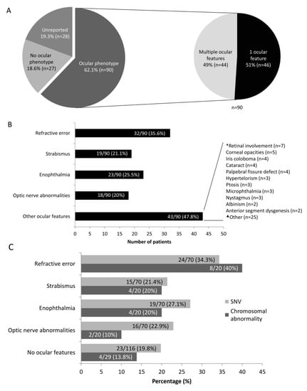 A review of the literature was also performed [19,20,22,23,24,25,26,27,28,29,30,32,39,40,41,42,43,44,45,46,47,48,49,50,51]. For each patient, their genetic defect and ocular phenotype was collected. Ocular features were categorised into refractive error, strabismus, enophthalmia (posterior displacement of the eye with sunken appearance), optic nerve abnormalities and other findings (Supplementary Table S2). Patients who unfortunately did not survive the neonatal period were not included in the analysis.