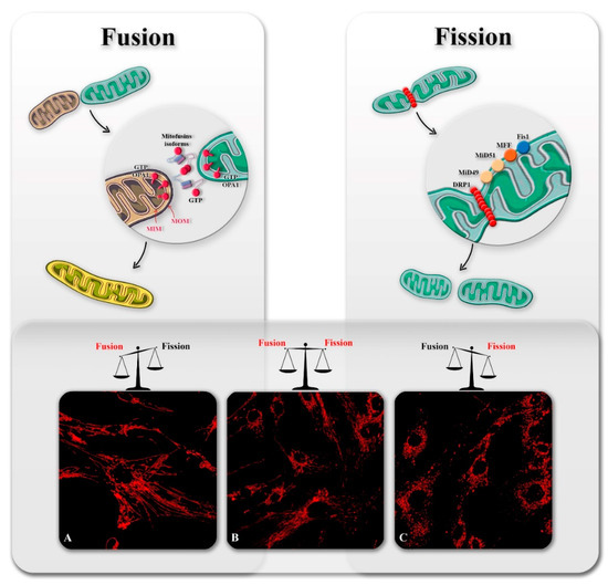 The central role of mitochondria in cellular health and survival explains why so many regulatory mechanisms are dedicated to the maintenance of mitochondrial homeostasis. Among the processes aimed at the defense of mitochondrial functions, mitochondrial dynamics are at the forefront, because fusion and fission machinery, through the control of mitochondrial morphology, take part in several cellular processes, including energy metabolism, apoptotic cell death, autophagy, and immune signaling [5,106,107]. For this reason, defects in mitochondrial dynamics have been associated with different human disorders, such as cancer, metabolic syndromes, and neurodegenerative disorders. In this section, we will focus our attention on fission and fusion defects related to MD.