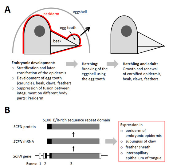 Recently, SFTPs were identified in birds, reptiles and amphibians [29,30], indicating that SFTPs are evolutionary ancient proteins required for terrestrial life. While turtles, geckos, alligators and chickens have two SFTP genes, CRNN and Scaffoldin (SCFN), also referred to as Trichohyalin-like [29,31], three SFTP genes, CRNN, SCFN1 and SCFN2, are present in snakes [32] and only SCFN is present in the anole lizard [29,33], songbirds (Passeri), cormorants and Accipitriformes (eagles, hawks, vultures, secretary birds and relatives) [34]. Screening for SFTP expression sites in the chicken revealed CRNN or SCFN in the subunguis of claws, the feather sheath, epithelial cells located between papillae of the tongue and in the embryonic periderm (Figure 1B). The embryonic beak including the egg tooth yielded positive signals for SCFN [29] which prompted us to perform more detailed studies that are reported in the present manuscript.