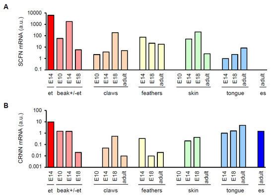Expression of chicken SFTP mRNAs during embryonic development. RNA was extracted from indicated tissues of adult chicken and chicken embryos at developmental stages E10, E14 and E18. Following cDNA synthesis, real-time PCRs were performed. mRNA levels of SCFN (A) and CRNN (B) are shown in arbitrary units (a.u.) which were calculated by normalization to the housekeeping gene HPRT1 in the same tissue and dividing the normalized value of each tissue by the normalized expression level in the tongue sample of stage E14. At developmental stage E14, the beak of the embryo was separated into two different parts—the egg tooth (et) and the remaining beak. es, esophagus.