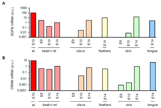 SFTP mRNAs expressed during embryonic development of quails. Indicated tissues were collected from quail embryos at developmental stages E8, E10 and E14, RNA was extracted, re-transcribed into cDNA and real-time PCRs were performed. mRNA levels of SCFN (A) and CRNN (B) are shown in arbitrary units (a.u.) which were calculated by normalization to the housekeeping gene HPRT1 in the same tissue and dividing the normalized value of each tissue by the normalized expression level in the beak sample of stage E14. The RNA of the egg tooth (et) and the remaining beak of the E10 embryo was extracted separately.