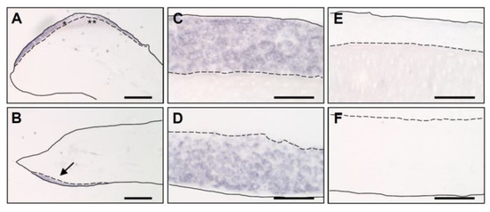 Tissue samples were fixed in formaldehyde and embedded in paraffin. There was no special treatment depending on the hardness of the samples. Hard cornified skin appendages were difficult to cut and to maintain in good shape during further processing, whereas samples from earlier stages of development were generally useful. The samples were sectioned at 5 µm thickness and mounted on Superfrost Ultra slides (Thermo Scientific). The sections were deparaffinized by melting at 58 °C for 1 h, followed by incubation in xylol for 2 × 15 min and an alcohol series (100%, 90%, 80%, 70%, 30% ethanol). After washing in phosphate-buffered saline (PBS) for 3 min, the sections were fixed in freshly prepared 4% paraformaldehyde in PBS on ice for 20 min. Then, the sections were washed with PBS for 2 × 3 min and incubated in 100 mM HCl at room temperature for 10 min. After washing with PBS for 2 × 3 min, the samples were incubated in 2× saline sodium citrate (SSC) at 70 °C for 30 min. Subsequently, the samples were washed with PBS for 2 × 3 min and digested with proteinase K (20 µg/mL in 50 mM Tris HCl) at 37 °C. After washing with PBS for 2 × 3 min, the samples were fixed with 4% paraformaldehyde in PBS on ice for 20 min, washed again with PBS and subjected to acetylation by 10-min incubation in 200 mL 0.1 M triethanolamine, pH 8, containing 500 µL acetic anhydride. Finally, the samples washed with PBS for 2 × 3 min, dehydrated in 30%, 70%, 80%, 90% and 100% ethanol and air-dried for 1 h. The slides were stored at −20 °C until hybridization with the probes.