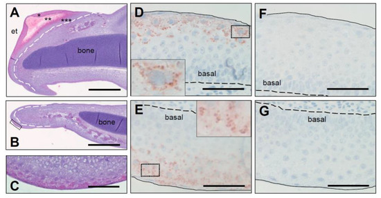 Expression of SCFN protein in the embryonic chicken egg tooth. Sections through the upper beak (A,D,F) and the lower beak (B,C,E,G) of chicken embryos at developmental stage E10 were immunohistologically stained with hematoxylin and eosin (A–C) or with mouse anti-SCFN serum (D,E). As control, anti-SCFN was blocked with the immunogen (F,G). The box in B indicates the area shown in a higher magnification in C. Insets in D and E show higher magnification of SCFN granules from the boxed areas of the sections. *, peridermal compartment of the egg tooth; **, cornified egg tooth; ***, beak underneath the egg tooth. et, egg tooth. Bars: 400 µm (A,B); 40 µm (C–G).