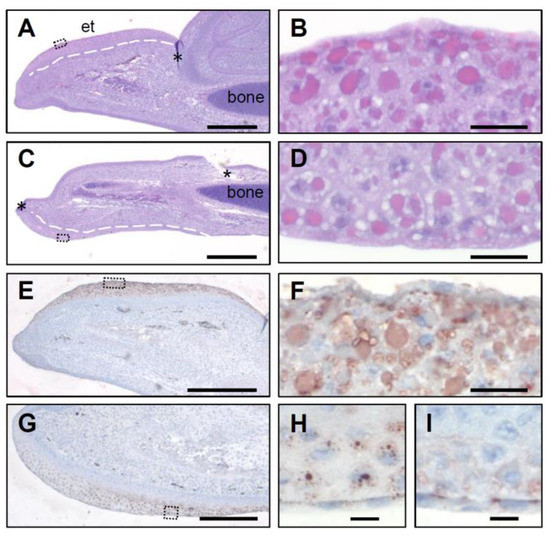 SCFN protein is expressed in the peridermal compartment of the quail egg tooth. Tissues were collected from quails at embryonic development stage E10. Hematoxylin and eosin stains of the upper (A,B) and lower beak (C,D) are shown. To localize SCFN protein in the quail beak, an immunohistochemical staining of SCFN was performed in the upper (E,F) and the lower quail beak (G,H). As control for the specificity of the result, anti-SCFN serum was blocked with the immunogenic peptide (I). Boxes in A, C, E and G indicate the region shown at higher magnification in B, D, F and H, respectively. Asterisks in A and C mark artefacts caused by the sectioning. Broken lines in A and C indicate border of periderm. et, egg tooth. Bars: 400 µm (A,C,E); 200 µm (G); 20 µm (B,D,F); 10 µm (H,I).