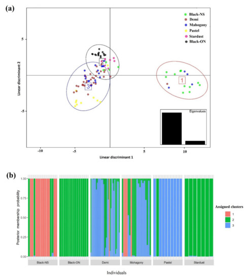 Discriminant analysis of principal components (DAPC) of five color-types of American mink: (a) The scatter plot of the first two linear discriminants for all samples. Color-types are presented by different colors and the three main clusters are shown by circles and numbers. The first two linear discriminants explained 89.68 and 10.32% of the variation, respectively; (b) The probability of membership of each sample in the three assigned clusters inferred by DAPC. Black-NS and Black-ON represent the black color-type samples collected from the Canadian Center for Fur Animal Research (Truro, NS, Canada) and Millbank Fur Farm (Rockwood, ON, Canada), respectively.