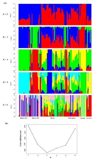 We also used the admixture analysis to reveal the admixture patterns assuming two to six ancestral populations (Figure 2). The lowest cross-validation error (0.49) was found for K = 3, indicating the best fitting model of admixture among the studied individuals (Figure 2b). Ancestral proportions at K = 3 indicated that Black-ON individuals were mainly assigned to the same cluster (on average, 92.36%). In addition, Pastel (on average, 78.17%) and Black-NS (on average, 62.94%) constructed two other main genetic compositions whereas other color-types (Demi, Mahogany, and Stardust) were admixed of these three clusters (Figure 2).