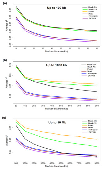 Linkage disequilibrium (LD) decays represented by the average r2 for inter-marker distances of (a) up to 100 kb using consecutive 10 kb bins (b) up to 1000 kb using consecutive 100 kb bins and (c) up to 10 Mb using consecutive 1000 kb bins. Black-NS and Black-ON represent the black color-type samples collected from the Canadian Center for Fur Animal Research (Truro, NS, Canada) and Millbank Fur Farm (Rockwood, ON, Canada), respectively.