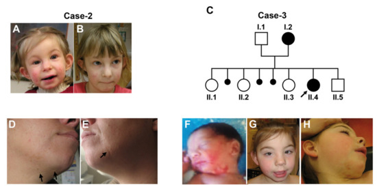Figure 1. Linear skin lesions in LSDMCA2 patients. (A,B) Case-2. She had asymmetric face with limited eyelid closure, linear skin defects on face and neck, which became less obvious with age ((A): age 110/12 years; (B): age 7 years). (C) Pedigree of Case-3. Parents are asymptomatic and unrelated. Three pregnancies ended with abortions. (DH) Photographs of Case-3 (II.4) and her mother (I.2). Individual I.2, presented with linear skin defects, which healed with scarring (arrows) (D,E). Individual II.4 had facial dysmorphism with telecanthus, long upslanting palpebral fissures, short nose, mild retrognathia, and posteriorly rotated ears (G). Linear and patchy erythrodermia on cheeks and neck, which were more pronounced at birth (F) compared to the age of 5 years (H). Hollow circles and squares indicate asyntomatic females and males, respectively. Solid circles indicate affected females. Small solid circles indicate aborted fetuses. Figure from [3] used with permission.