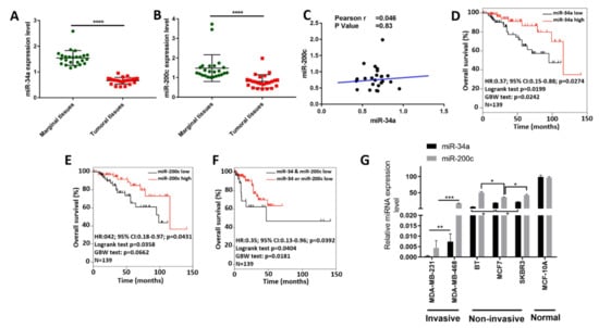 3.1. MiR-34a and miR-200c Are Downregulated in Breast Cancer Tissues and Invasive Cell Lines and This Predicts Poor Patient Survival