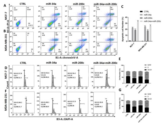 Exogenous miR-34a and miR-200c expression additionally induce apoptosis and G2/M cell cycle arrest. (A–C) Annexin V/propidium iodide assays following transfection of miR-34a, miR-200c and the combination in MCF-7 and MDA-MB-231 breast cancer cell lines. (D,E) Cell cycle profiles and respective quantifications of MCF-7, and (F,G) and MDA-MB-231 cells stained with DAPI and subjected to flow cytometry. Abbreviations: *, p-value < 0.05; **, p-value < 0.01.