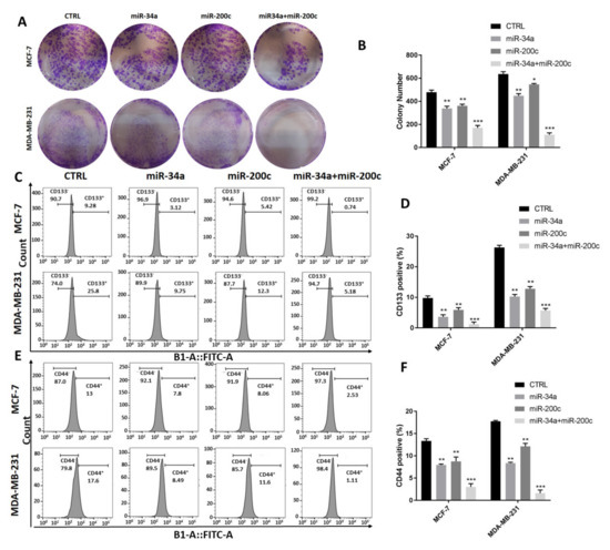 We next study how miR-34a and miR-200c might affect cancer stem cell properties in the context of breast cancer development. To that end, we performed colony formation assays. This revealed that combined miR-34a and miR-200c expression decreases the number of colonies formed by co-transfected BC cells more significantly than those formed by cells that were transfected with miR-34a or miR-200c individually, and this applies to both invasive and non-invasive cells (Figure 4A,B).