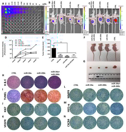 Individual and co-delivery of miR-34a and mir-200c suppress cancer development in a xenograft mouse model. (A) Bioluminescence imaging of serially diluted MDA-MB-231 cells, which stably express luciferase. (B) Bioluminescence imaging of mice with tumor formation prior to miRNA treatment. (C) Bioluminescence imaging of mice after intra-tumor injections with indicated miRNAs. (D) Quantification of bioluminescence intensities of mouse tumors after intra-tumor injections with indicated miRNAs. Measurements of tumor volumes (E), Images of mice (F), excised tumors (G) for indicated groups. ***, p < 0.001. (H,I) H&E staining on each tumor (H) and TUNEL assay to show apoptosis induction (I) after miRNA transfection. (J–N) Immunohistochemistry staining for Ki67, VEGFR, MMP9, HIF1-α and CXCR4, respectively.