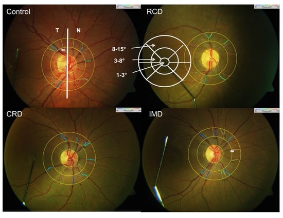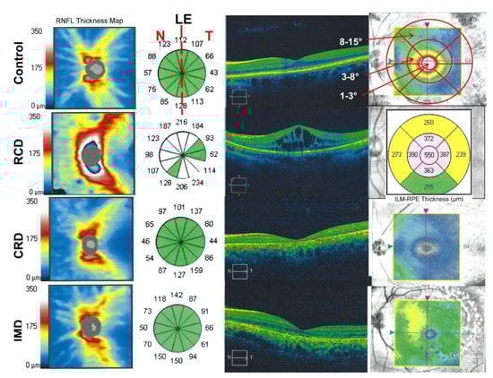 An example of RNFL thickness (12 scans, 6-mm optic nerve head-centered raster) and macular thickness protocol (Macular Cube 512 × 128) of a control subject (top, left eye), a patient with RCD (left eye), a patient with CRD (left eye) and a patient with IMD (bottom, left eye). The naso-temporal values were calculated from the values corresponding to the nasal and temporal main peripapillary vessels. The ETDRS chart for calculation of the central retinal exposure parameters in zones is plotted around the fovea.