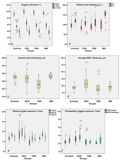 Box plots for the evaluated parameters, as follows: oxygen saturation (a); retinal vessel diameter (b), central retinal thickness (c), RNFL thickness (d), central oxygen exposure in zones (e) and peripapillary naso-temporal oxygen exposure (f) parameters.