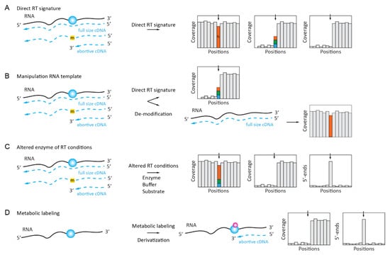 Natural RT signatures consist of the altered reading of the modified nucleotide during primer extension by an RNA-dependent RNA polymerase (reverse transcriptase, RT). Depending on the nature of the nucleotide, such a signature may represent a “mutation” as compared to the expected reference sequence or constitute a more complex profile composed of mis-incorporations at different proportions in addition to the abortive RT products that end at the modified nucleotide. Such RT signatures can be manipulated by the pre-treatment of the RNA template (e.g., by the de-modification/removal of modified residues), by the choice of a particular condition of the primer extension, or by the use of non-natural dNTP substrate(s) and mutants of the RT active site. The in vivo metabolic labeling described later in this review also allows for the incorporation of reactive chemical groups at positions of certain modifications (methyl groups) and, thus, also helps to alter the RT signature of the modified RNA template (Figure 1D).