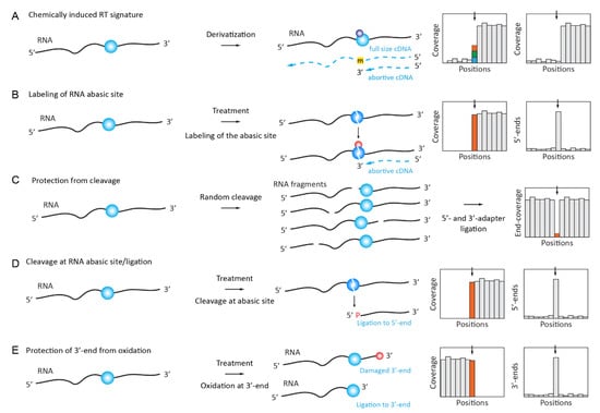 Detection of RNA modifications using chemically induced RT signatures or specific cleavage of the RNA ribose-phosphate backbone. (A): RNA treatment by a specific chemical reagent induces RT signature at the modified RNA residue in the form of a mis-incorporation profile (different nucleotides are shown by color) or abortive cDNA synthesis products. (B): chemical treatment selectively removes RNA-modified base by the cleavage of the N-glycosidic bond, releasing an RNA abasic site which can be labeled using an aldehyde-specific probe. (C): RNA modification induces the protection of the RNA backbone against cleavage (negative detection in RiboMethSeq and HydraPsiSeq protocols), thus excluding fragments starting and ending at the modified nucleotide. The signal is seen as a characteristic “gap” in 5’/3’-end coverage. (D): chemical treatment induces the cleavage of the RNA backbone and the release of a 5’-phosphate, which is a competent in 5’-adapter ligation. Panel (E): RNA modification (here, 3’-terminal Nm residues released by random RNA fragmentation) protects RNA from NaIO4 oxidation, thus maintaining the efficient ligation of the 3’ adapter.