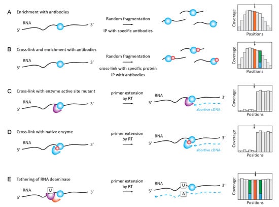 Detection of RNA modifications by immunoaffinity and other affinity-related methods. (A): A classical Me-RIP approach first applied to m6A and further extended also to non-methylated modified nucleotides. RNA is fragmented and the modification-containing fraction is enriched by immunoprecipitation. The signal of Me-RIP is somehow asymmetric, and a modified nucleotide may be displaced from the peak summit. Panel (B): immunoprecipitation-based individual-nucleotide resolution UV crosslinking and immunoprecipitation/Photoactivatable Ribonucleoside-Enhanced Crosslinking and Immunoprecipitation (iCLIP)/PAR-CLIP approaches using the covalent cross-linking of the specific antibody to RNA in the proximity of RNA modification. RT signature (shown in blue/green and resulting from RNA/protein cross-link may be visible in proximity to the modified nucleotide. Panel (C): A covalent cross-linking with the modified residue when the enzyme active site mutant is used. Described for m5C and m5U methylating enzymes, which use a two-step reaction mechanism. Panel (D): cross-linking with the native enzyme may be achieved by the incorporation of non-natural nucleotides in RNA in vitro or in vivo (metabolic labeling). Panel (E): Reader protein for RNA modification is fused with the RNA deaminase domain (APOBEC) and, thus, tethered to the modified RNA residue (shown in orange), inducing partial C→U deamination in close proximity to RNA modification. These partial deamination signatures are visible in the sequencing profiles (shown in green/blue).