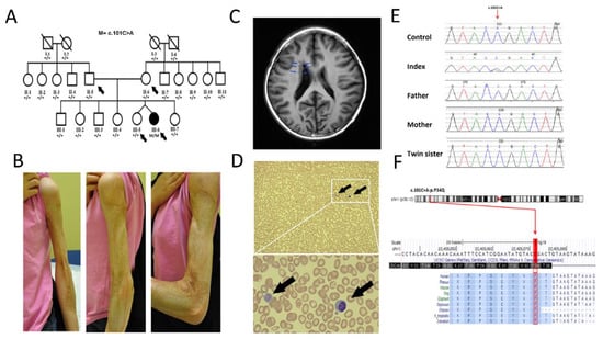 The proband (III-6) is part of the dizygotic twin and the other twin (III-5) is a healthy sister with no complaint (Figure 1A). She is a product of full term normal spontaneous vaginal delivery with an appropriate Apgar score and growth parameters. The first concern was noted in the first year of life when the parents noticed recurrent upper respiratory tract infections that required several courses of antibiotics. As she grew up, these URTI-like episodes became associated with an intense systemic response with high-grade fever, elevated inflammatory markers, and chronic anemia. She had frequent hospitalization for IV antibiotics.