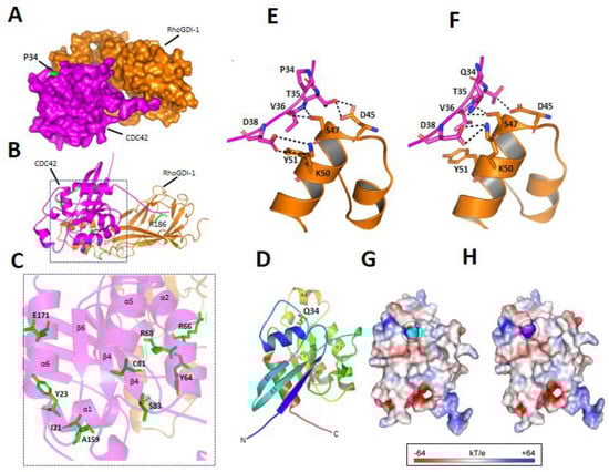 It has been documented that the guanine nucleotide dissociation inhibitor (GDI), which is a family of small GTPases, acts as a significant signaling inhibitor via Rho family GTP-binding proteins (CDC42). The crystal structure of CDC42 with RhoGDI-1 was retrieved from the Protein Data Bank (PDB) with accession number 1DOA []. The mutant structure was modeled and energy minimized using Discovery Studio 2.0 (Accelrys) in order to elucidate the impact of substituted proline to glutamine at residue 34. The electrostatic potential surface of wild and mutant CDC42 was calculated using the PyMOL-based “apbsplugin.py” tool. Figures were made using the PyMOL molecular viewer https://pymol.org/ (accessed on 16 January 2021).