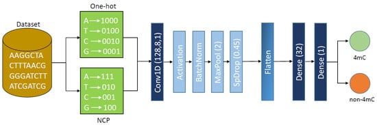 In conventional machine learning, features need to be extracted by a data scientist in order to minimize the sophistication of the data and make the patterns easily apparent for the learning algorithms. On the other hand, neural networks work in a systematic way to extract the high-level features themselves from the data [,,]. This removes the need for domain knowledge and the extraction of hard-core features. Therefore, we have proposed a CNN-based model for the first time for this specific mouse dataset to achieve higher accuracy for the prediction of 4mC sites. Unlike the conventional ML-based techniques, it only uses one-hot encoding and nucleotide chemical properties (NCPs) for feature extraction, and it learns high-level abstract features using the neural network architecture.