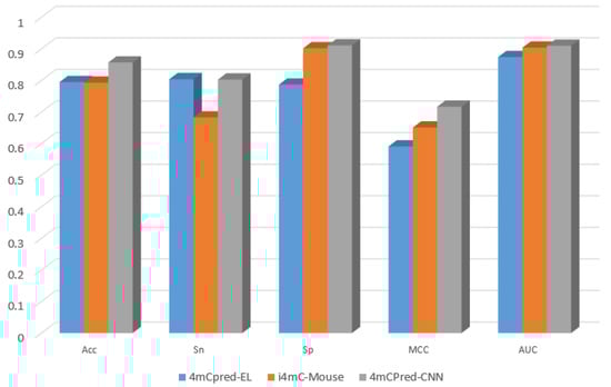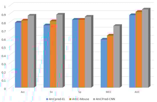 Using the same independent dataset used for 4mCpred-EL and i4mC-Mouse, which was comprising of 160 4mCs and the same number of non-4mCs, we compared 4mCPred-CNN with these two state-of-the-art techniques and illustrated the results in Table 3. Similarly to what was found above, the outputs of 4mCpred-EL and i4mC-Mouse on the independent dataset were directly quoted from i4mC-Mouse [], which was yielded by submitting the dataset directly to the server. The proposed model, 4mCPred-CNN, outperformed 4mCpred-EL and i4mC-Mouse by 8.4 and 5.89 p.p for accuracy, 13.03 and 8.04 p.p for sensitivity, 3.74 and 3.73 p.p for specificity, 16.6 and 11.7 p.p for the MCC, and 6.9 and 3 p.p for AUC, respectively, on the independent dataset. A graphical representation of the achieved results can be seen in Figure 3.
