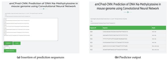 To provide the research community with quick access to the proposed tool, a web server was created and made publicly available at http://nsclbio.jbnu.ac.kr/tools/4mCPred-CNN/ (accessed on 24 January 2021). Figure 5 shows a snippet from the web server; an example of adding prediction sequences is shown in Figure 5a, and the performance of the predictor is shown in Figure 5b.