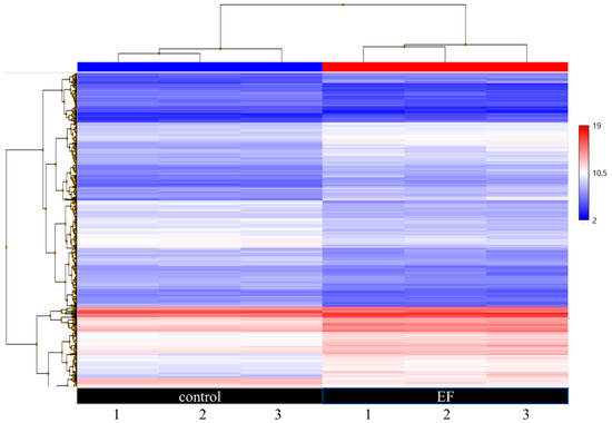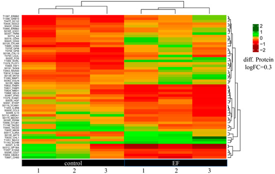Heatmap of differentially expressed proteins in hTCEpi cells after treatment with AC EFs for 24 h. Both upregulated and downregulated proteins with logFC values of 0.3 were clustered. Untreated hTCEpi cells served as control.