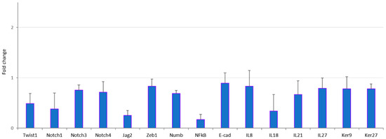 Validation of the ClariomTM S array analyzed transcripts using qRT-PCR. The hTCEpi cells were cultured in the presence of AC EFs and RNA was isolated after 24 h. Reverse transcription was performed using 1 µg of total RNA to prepare cDNA and qRT-PCR was performed to compare the expression analysis of different transcripts using respective primers for Twist1, Notch1, Notch3, Notch4, Jag2, Zeb1, Numb, NFkB, E-Cad, IL8, IL18, IL21, IL27, Ker9 and Ker27. Relative expression patterns were analyzed using the comparative threshold cycle (2−ΔΔCt) method. Expression values are represented as fold changes over the control on an arbitrary scale after normalization with GAPDH. Further, these transcripts displayed similar expression profile during ClariomTM S Arrays. Data represent means ± standard deviations of three independent experiments.