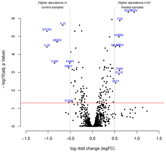 The antibody microarray identified differentially enriched proteins after the treatment of hTCEpi cells with AC EFs. The volcano plot visualizes the p-values (adjusted for multiple testing) and corresponding log-fold changes. The log-fold change of the difference in abundance is shown horizontally, whereas the vertical axis represents the significance level. The logFC cutoffs are depicted as vertical lines. The black dots represent analyzed proteins. The horizontal red line indicates an adjusted p-value of 0.05, above which all proteins are considered to vary significantly. Proteins with a positive log-fold change display higher abundance in EF-treated samples, whereas proteins with a negative value display higher abundance in control samples.