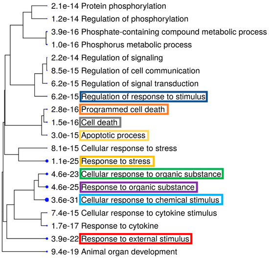 Enriched biological processes after treatment of hTCEpi cells with AC EFs for 24 h. Significantly enriched biological processes following analysis of the gene array data are highlighted as an interactive hierarchical clustering tree using ShinyGO. Biological processes with many shared genes are clustered together. Bigger dots indicate more significant p-values. Enriched biological processes that were similar after analysis of both gene and proteins array data are marked and highlighted. Analysis was performed using ShinyGO (v.0.61) (Available online: http://bioinformatics.sdstate.edu/go/ (accessed on 6 January 2021)).