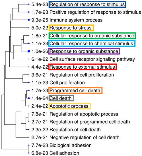 Enriched biological processes after treatment of hTCEpi cells with AC EFs for 24 h. Significantly enriched biological processes following analysis of the antibody array data are highlighted as an interactive hierarchical clustering tree using ShinyGO. Biological processes with many shared genes are clustered together. Bigger dots indicate more significant p-values. Enriched biological processes that were similar after analysis of both gene and protein array data are marked and highlighted. Analysis was performed using ShinyGO (v.0.61) (Available online: http://bioinformatics.sdstate.edu/go/ (accessed 6 January 2021)).