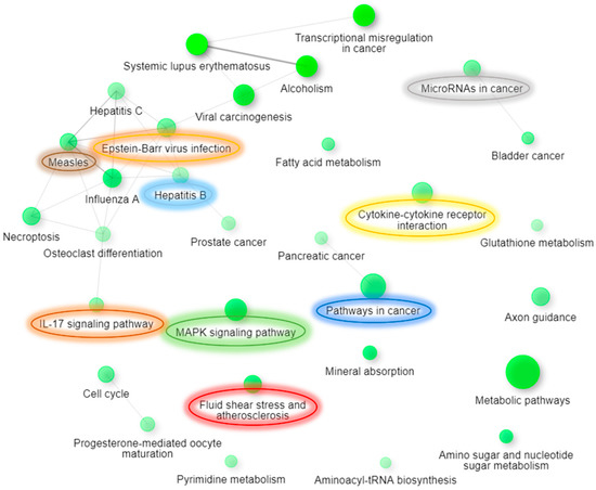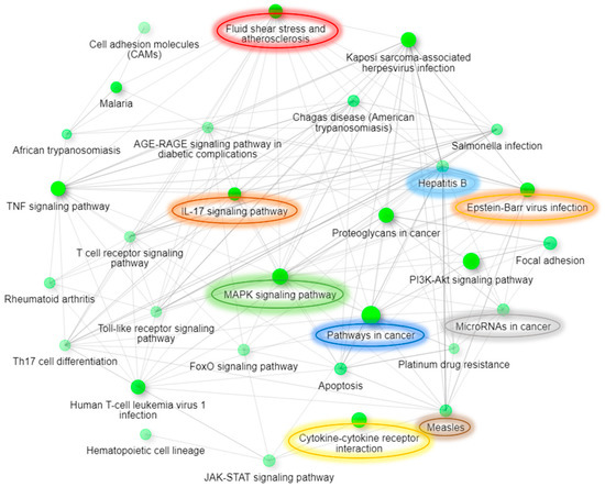 Enriched molecular pathways after treatment of hTCEpi cells with AC EFs for 24 h. The relationships between pathways are depicted and highlighted as an interactive graphical network using ShinyGO. Pathways enriched following analysis of the antibody array data are shown. Two pathways (nodes) are connected after sharing 20% or more genes. Enriched pathways that were similar after analysis of both gene and protein array data are marked and highlighted. Node colors illustrate enrichment, whereby darker nodes represent significantly enriched gene sets, while bigger nodes represent larger gene sets. Thicker edges represent more overlapped genes. Analysis was performed using ShinyGO (v.0.61) (Available online: http://bioinformatics.sdstate.edu/go/ (accessed on 6 January 2021)). Edge cut-off = 0.2 and FDR p-value cut-off = 0.05.