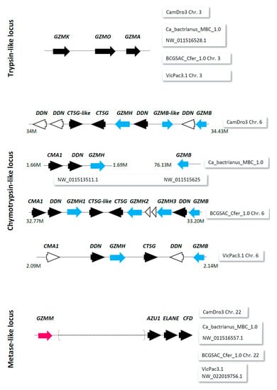 Genomic organization of granzyme genes in camelids. Three separate genomic regions (trypsin-like, chymotrypsin-like, and metase-like locus) contain granzyme coding genes (GZMA, GZMB, GZMH, GZMK, GZMM, and GZMO) in NCBI reference genomes of camels and alpaca (see tags). Other closely related potentially functional genes (full arrows) or pseudogenes (empty arrows) were duodenase (DDN), cathepsin G (CTSG), chymase (CMA1), azurocidin (AZU1), neutrophil elastase (ELANE), and complement factor D (CFD). The presence of non-homologous genes in the metase-like locus is indicated by parentheses. Coordinates are given in megabases (M). cyan, magenta—highlight granzyme genes.