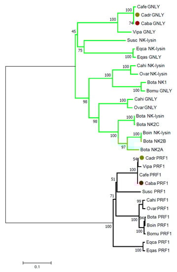 Phylogeny of pore-forming proteins in domesticated ungulates. Amino acid sequences for perforin (PRF1) and granulysin (GNLY)/ NK-lysin of dromedary (Cadr) and Bactrian camel (Caba), highlighted by color dots, were compared to reference sequences of wild camel (Cafe), alpaca (Vipa), swine (Susc), goat (Cahi), sheep (Ovar), cattle (Bota), zebu cattle (Boin), wild yak (Bomu), horse (Eqca), and donkey (Eqas) (for accession numbers see Table S2 and KT715031 for bovine NK-lysins NK1, NK2A, NK2B, and NK2C), and analyzed in MEGA X. The evolutionary history was inferred by the Neighbor-Joining method and the evolutionary distances were computed using the p-distance method and are given in the units of amino acid differences per site. The percentages of concordant replicates in the bootstrap test (1000 replicates) are shown next to the branches. Bold—pore-forming protein for eukaryotic membranes; green—pore-forming proteins for prokaryotic (mitochondrial) membranes.