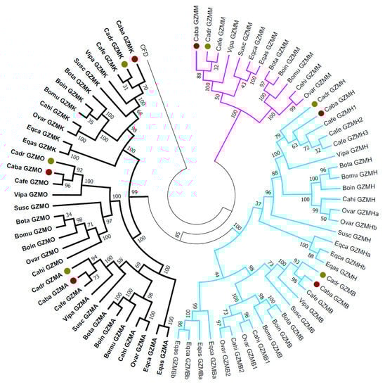 An overview of phylogenetic relationships among six types of granzymes in ungulates is in Figure 3. The granzyme amino acid sequences formed three main clades according to the chromosomal region and supposed specificity (trypsin-like, chymotrypsin-like, and metase-like). Within each granzyme sub-clade, separation of odd-toed ungulates (Equidae) and even-toed ungulates (Bovidae, Suidae, and Camelidae) was observed, except for GZMO (not present in equids) and GZMM, whose swine and equid sequences are highly homologous. The camelid sequences grouped mostly with swine sequences as sister clades, except GZMO and GZMH.