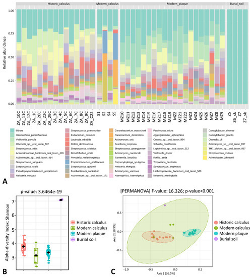 Species-level comparison of bacterial profiles in 16–17th century human archaeological dental calculus, modern dental calculus, modern dental plaque and burial soil samples: (A) Stacked plots of the taxonomic classification. The abundances of the most abundant species are shown; (B) Shannon diversity analysis; (C) Principal coordinates analysis (PCoA) derived from Bray–Curtis distances among samples of the four groups (p < 0.001 by PERMANOVA). For each axis, in square brackets, the percent of variation explained was reported.