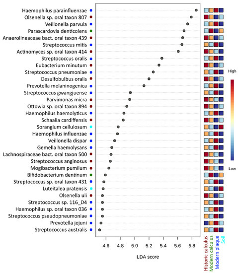 LEfSe analysis identified 34 differentially abundant bacterial taxa in the microbiotas of historic dental calculus, modern calculus, modern dental plaque and burial soil samples (LDA score [log 10] > 4.5) (Figure 3). Within the most significant LEfSe results (LDA score [log10] > 5.0) at the species level, we found six microbial species that were mainly attributed to the modern dental plaque sample group (Haemophilus parainfluenzae, Veillonella parvula, Streptococcus mitis, Streptococcus oralis, Streptococcus pneumoniae, Prevotella melaninogenica) and five species were attributed to the historic dental calculus sample group (Olsenella sp. oral taxon 807, Anaerolineaceae bacterium oral taxon 439, Actinomyces sp. oral taxon 414, Eubacterium minutum and Desulfobulbus oralis) (Figure 3).