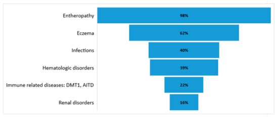 IPEX syndrome is diagnosed in the first year of life in males as multiple autoimmune diseases syndrome. In some patients, a milder form of the disease appears after the first year as late-onset IPEX syndrome [55]. IPEX syndrome is characterized by three main clinical manifestations: enteropathy, endocrinopathy, and dermatitis. Park et al., after a systemic review of 75 articles and data from 195 patients, presented the occurrence of the clinical manifestations of IPEX syndrome: enteropathy (97.7%), skin manifestations (62.1%), endocrinopathy (53.3%), hematologic abnormalities (38.5%), infections (40%), other immune-related complications (22.1%), and renal diseases (16.4%) [56].