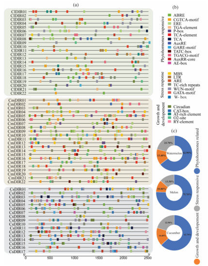 Cis-elements in the promoter regions of ClDIR, CmDIR and CsDIR genes. Different colors denote different cis-elements and classification is done according to their role in different activities. (a) Distribution of important cis-elements on promoter region, (b) Classification of cis-elements according to their function. (c) The ratio of various cis-elements in three different categories is presented in pie charts.