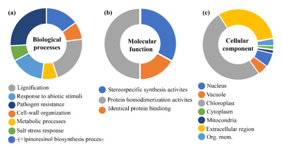 To reveal the potential function of DIR genes, we presented a gene ontology (GO) enrichment analysis of the dirigent proteins to predict the putative functions of DIR genes in the biological, molecular and cellular processes (Figure 4) [44]. The prediction of biological processes highlighted potential roles in pathogen resistance, cell-wall origination, lignification, and pinoresinol biosynthesis. Likewise, the prediction in cellular components clarified that most of the genes are involved in chloroplast followed by extracellular regions, which is very similar to our subcellular localization predictions. The present results evidenced the validity of other subcellular prediction methods used in this study. In addition, the prediction of molecular processes suggested that most are involved in protein homodimerization activities followed by stereospecific synthesis and protein-binding activities. The involvement of these proteins in different biological functions such as lignification, pathogens response, cell-wall organization, and response to biotic stress supports the findings of other previous studies. According to GO analysis results in different species of cucurbits, the majority of DIR genes from different species including Arabidopsis (AtDIRs), rice (OsDIRs), flax (LuDIRs), sugarcane (ShDIRs), cotton (GhDIRs), and chili (CaDIRs) showed similar roles, when selected genes from these species were functionally characterized.
