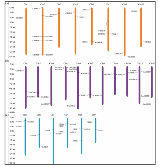 Chromosome mapping of dirigent genes on different cucurbit species. Chromosome numbers are demonstrated on each chromosome and scale is expressed in megabase (Mb). (a) Dirigent genes on chromosomes of watermelon (Citrullus lanatus). (b) Location of dirigent genes on melon (Cucumis melo) chromosomes. (c) Mapping of dirigent genes on cucumber chromosomes (Cucumis sativus).