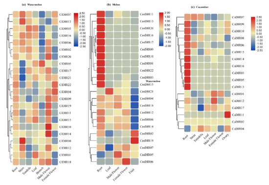 Different DIR gene members may exhibit variations in the level of mRNA accumulation among different tissue during the growth and development process of plants. Differential expression in response to stress or sole expression in a certain tissue might indicate a gene function. The tissue-specific expression patterns were evaluated in several plant-tissues such as root, stem, branch, tendrils, leaf, male, female, flower, etc. to explore the potential biological functions of ClDIR, CmDIR, and CsDIR genes during growth and development processes.