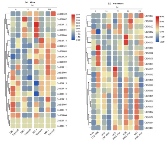 Heatmap of transcription profiling (Log2-based RPKM values (melon) and qRT-PCR (watermelon)) of CmDIR and ClDIR genes in resistant and sensitive cultivars of C. melo and C. lanatus. (a) The heat map representing response of MR-1 (resistant) and Topmark (susceptible) cultivars after different times (hours) post inoculation. (b) Heatmap generated from the qRT-PCR data (log2 transformed) obtained from M16 (resistant) and ZXG1996 (susceptible) cultivars of watermelon after PM inoculation.
