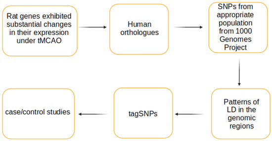 In this paper we proposed a workflow to identify the genetic markers associated with the outcomes of ischemic stroke. It is based on candidate gene approach that requires a prior knowledge about the system under consideration. We hypothesized that such information, particularly, a list of gene-candidates, can be taken from the model studies of brain ischemia in rat. Namely, we took 24 genes exhibited substantial changes in their expression in brain rat after tMCAO and using the workflow proposed obtained a list of the SNPs (tagSNPs with eQTLs abilities) that can be potentially applied in case–control studies.