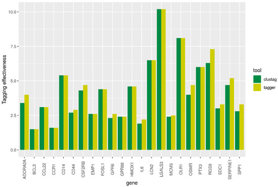 We extracted 23 of 24 human orthologues in rat using such projects as Ensembl, PANTHER, PhylomeDB, and MetaPhOrs. Different repositories resulted in the same list of orthologues that showed a one-to-one relationship between human and rat genes. The exception was Glycam1 gene, which orthologue was not identified. The human GLYCAM1 is pseudogene. The genes extracted from Ensembl are presented in Table 1. The numbers of SNPs identified in each gene including flanking regions are given in Supplementary Table S1. The high-LD regions revealed with three approaches were in good agreement. The TE for CLUSTAG and Tagger are presented in Figure 2. In general Tagger demonstrated higher values of TE than CLUSTAG. Therefore, the tagSNPs revealed by Tagger were used for further analyses, particularly, searching eQTLs.