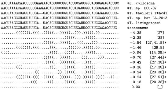 - Bernhart, S.H.; Hofacker, I.L.; Will, S.; Gruber, A.R.; Stadler, P.F. RNAalifold: Improved consensus structure prediction for RNA alignments. BMC Bioinform. 2008, 9, 474. [Google Scholar] [CrossRef]