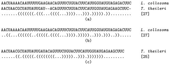 Here, the hishape [27] for the aligned SL RNA sequences corresponds to hishape [27] in L. collosoma and hishape [25] in T. theileri.