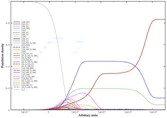 Folding kinetics of the trp-attenuator alignment simulated with RNAliHiKinetics. The simulation was based on all strictly negative hishapes plus the open chain ([_]), which was used as the starting structure for this simulation.