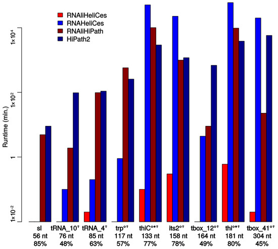 In order to analyse the runtime of RNAliHiKinetics, we collected nine alignments of different RNA families with lengths ranging from 56 to 304 nucleotides and simulated folding kinetics based on the top 100 consensus hishapes. The results are summarized in Figure 6 and nicely show that the consensus approach of RNAliHiKinetics (RNAliHeliCes + RNAliHiPath) improves efficiency by up to two orders of magnitude compared to RNAHiKinetics (RNAHeliCes + HiPath2). It is important to note that, for the single sequence approach of RNAHiKinetics, most computations had to be restricted to the 100 best hishapes (marked with ‘*’ in Figure 6) to achieve acceptable runtime.